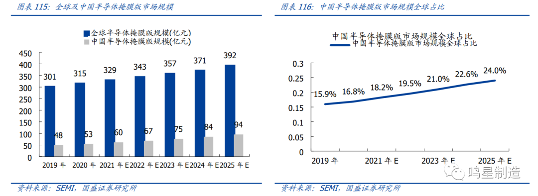 *半导体掩膜版:根据SEMI数据显示,全球半导体掩膜版市场规模及中国半导体掩膜版全球占比均逐年上升。2025年全球半导体掩膜版行业的市场规模预计将突破392亿元,其中,中国半导体掩膜版行业市场规模约为94亿元,全球占比可达24%。