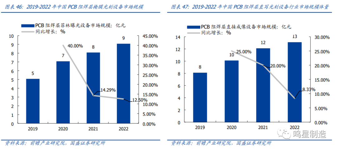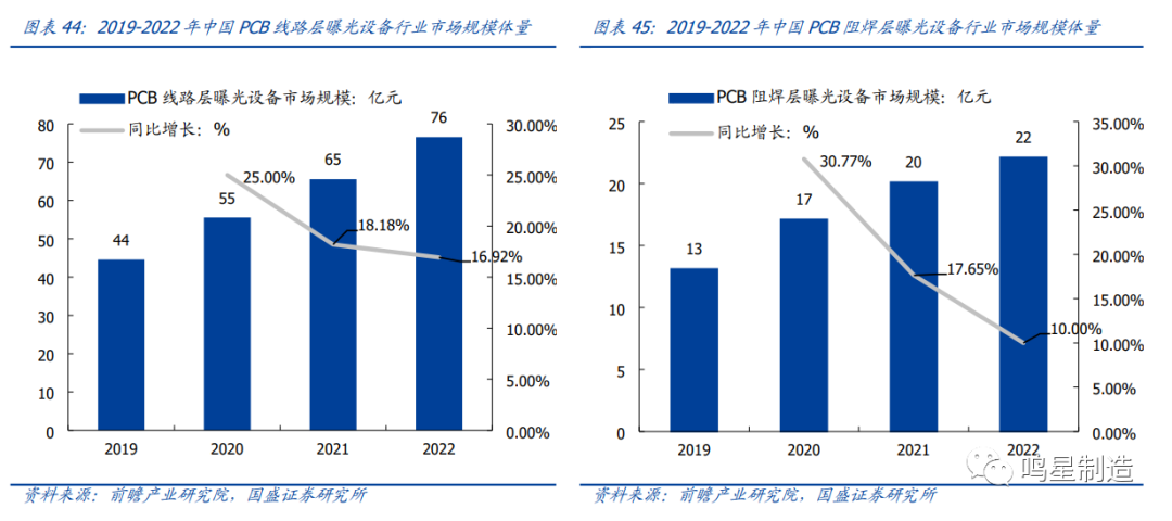 *阻焊层:PCB阻焊层曝光设备行业市场规模占PCB曝光设备行业总市场规模的23%左右,从2019年的13亿元持续增长至2022年的22亿元,2019-2022年的复合增长率达到19.17%。