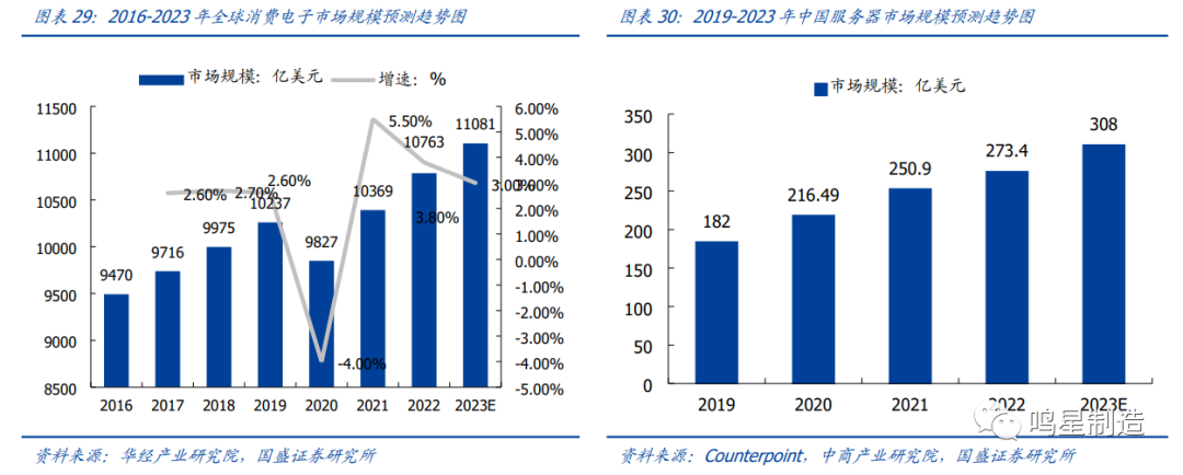 PCB下游多板块需求强劲,消费电子周期底部复苏,服务器、通信等板块高增长。根据华经产业研究院发布的《2022-2027年中国消费电子行业发展前景及投资战略咨询报告》显示,全球消费电子市场规模在2020年受疫情影响而有所下滑,市场规模为9827亿美元。但随着新兴技术如5G、VR、物联网等的发展和应用,全球消费电子市场将呈现复苏态势,全球消费电子市场规模有望在2023年恢复到11081亿美元的水平。