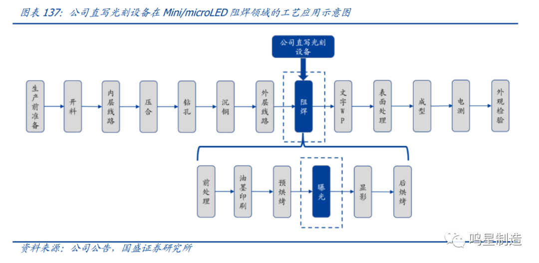 *在Mini/MicroLED中,由于Mini/MicroLED显示面板器件数量繁多且线间距密集,要求阻焊层曝光精度较高,保证50-60μm之间,同时需匹配高反射率的阻焊油墨使用。目前,除直写光刻技术外,采用底片曝光的传统曝光技术也有应用。但是,随着Mini/microLED面板尺寸、显示效果、器件数量的要求不断提升,传统的曝光技术无法满足阻焊层曝光精度需求,为直写光刻技术的应用渗透提供了市场机遇。