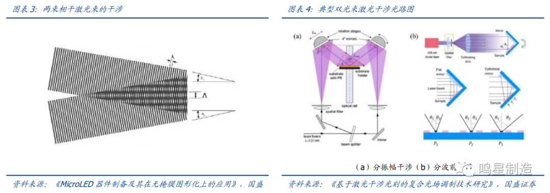 (1)干涉光刻(Interference Lithography,即IL)。激光干涉光刻技术是一种基于光学原理的典型无掩膜光刻技术,其光刻图形是通过激光束之间的相互干涉而生成的,利用双光束或者多光束的一次、多次曝光会产生周期性的图形,如周期性光栅、阵列孔等,进而满足需求。也就是说,干涉光刻技术就是利用光的干涉与衍射特性,对光束按一定规律进行组合,从而控制干涉场中的光强分布,经过多次迭代曝光可以产生复杂的二维图形。比如采用双光束干涉可制备光栅结构,采用三束、四束等多束激光干涉可制备矩形点阵、蜂窝状图形等。