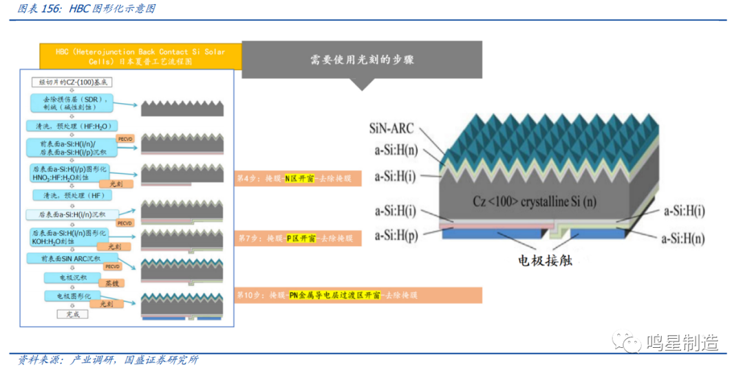*HBC图形化:HJT的一个方向是叠加IBC电池结构成为交叉指式背接触异质结(HBC)电池,在硅片表面同时采用本征的非晶硅进行表面钝化,在背面分别采用N型和P型的非晶硅薄膜形成异质结。图形化可应用于N\P区、PN金属导电层过渡区开窗。