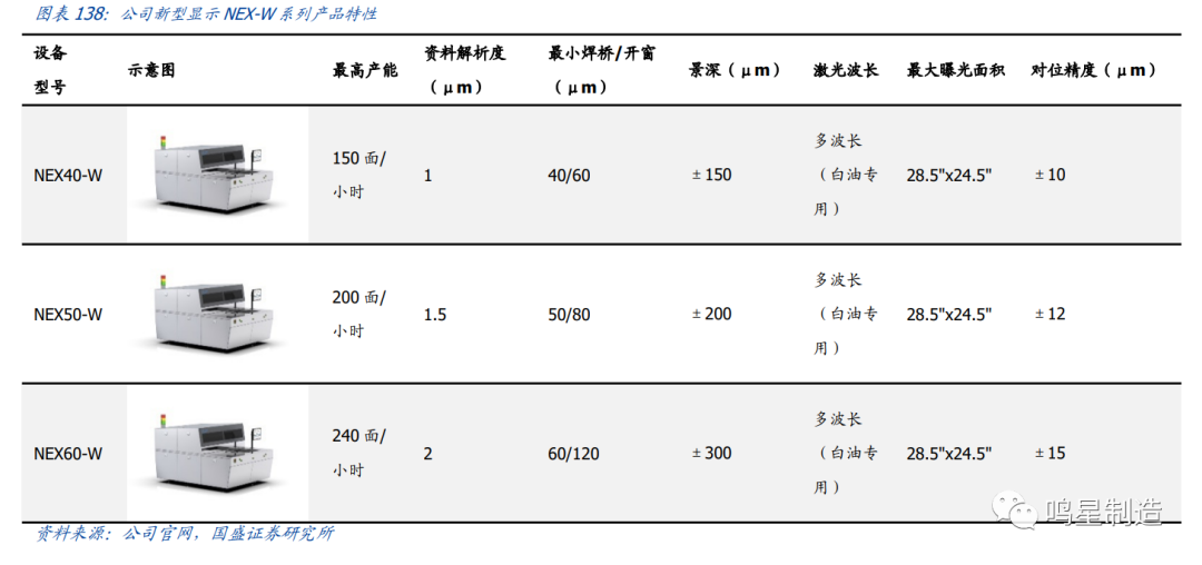 5)新型显示:Mini/Micro LED前景广阔,带来直写光刻设备市场新增量。在Mini/MicroLED阻焊层曝光中,直写光刻技术为未来主流方向,公司以NEX-W(白油)机型为重点,以点带面切入客户供应链。目前已开拓维信诺、辰显光电、沃格光电等优质客户。