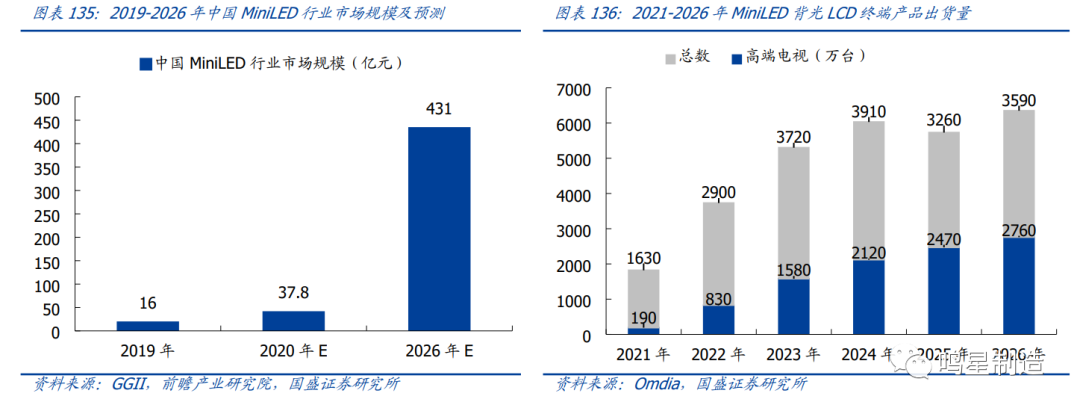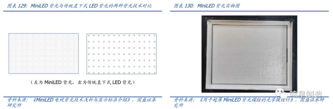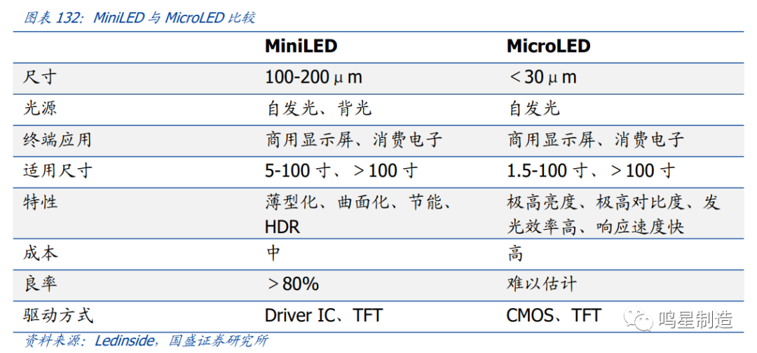 *微发光二极管(Mini/MicroLED)。是基于微小的LED晶体颗粒作为像素发光点的显示技术。MicroLED还在技术发展阶段,MiniLED则处于量产上升期。