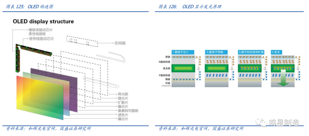 *有机发光二极管(高世代OLED)。OLED是第三代显示技术,属自发光型,不需要背光源,是有机半导体材料和发光材料在电场驱动下,通过载流子注入和复合导致发光。OLED器件结构为阳极、金属阴极以及夹在中间的有机功能层,呈现三明治结构。在一定电压驱动下,电子和空穴分别从阴极和阳极注入到电子和空穴传输层,两者在发光层中复合形成单线态或三线态激子,激子经辐射衰变以光子形式发出。OLED的特性是主动发光,理论上可视度和亮度较高,具有轻薄、能耗低、亮度高、颜色鲜艳、响应速度快、发光率好、可以显示纯黑色、可弯曲等优点。OLED显示面板现已广泛应用于智能手机、电视、可穿戴设备、VR、车载显示屏幕等领域。但其缺点在于有机材料有不可逆转的寿命问题,易产生色偏或烧屏,此外OLED的成本也较高。