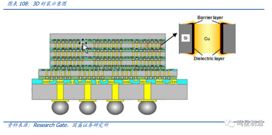 *3D 封装。3D 封装是将芯片与芯片直接堆叠在一起,裸片之间通过有源中介层连接。这种上下垂直的堆叠方式显著区别于2.5D封装的左右水平堆叠方式,因而被称为3D 封装。如前所述,2.5D封装是通过微凸块或TSV将元件左右水平放置在中介层上,3D封装是将多层硅晶圆与采用TSV的元件连接在一起,也就是说要实现上下垂直堆叠,必须将TSV制作在含有晶体管的芯片上,难度很高。TSV技术是2.5D和3D 封装中的关键技术。3D封装可以实现相当大的尺寸和重量降低,提高了产品容量和性能,目前广泛用于高带宽内存(HBM)处理器中。
