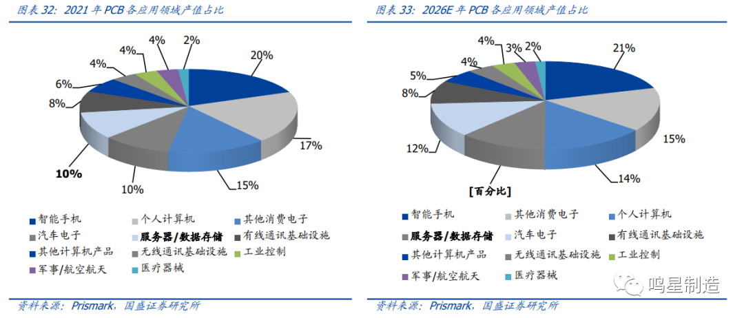 *服务器板块高增长:AI快速发展带来的大算力时代,激发HDI、类载板、IC载板等中高端PCB板需求,也激发了对服务器等数据存储板块的需求。根据中商产业研究院,我国服务器市场规模由2019年的182亿美元增长至2022年的273.4亿美元,复合增长率约为14.5%,预计2023年将增至308亿美元。据Prismark预测,从全球PCB各应用领域来看,应用于服务器的PCB产值在2026年将达到125.74亿美元,占比将达12%,2021年-2026年的复合增长率为10.0%。由于服务器的算力提升主要依靠CPU、芯片和总线,而PCB是pcle总线的关键组件,总线的升级对于PCB的层数和介电损耗有要求,因而服务器PCB的层数增加和其它性能的升级也会同步推动HDI、类载板、IC载板等中高端PCB的需求。