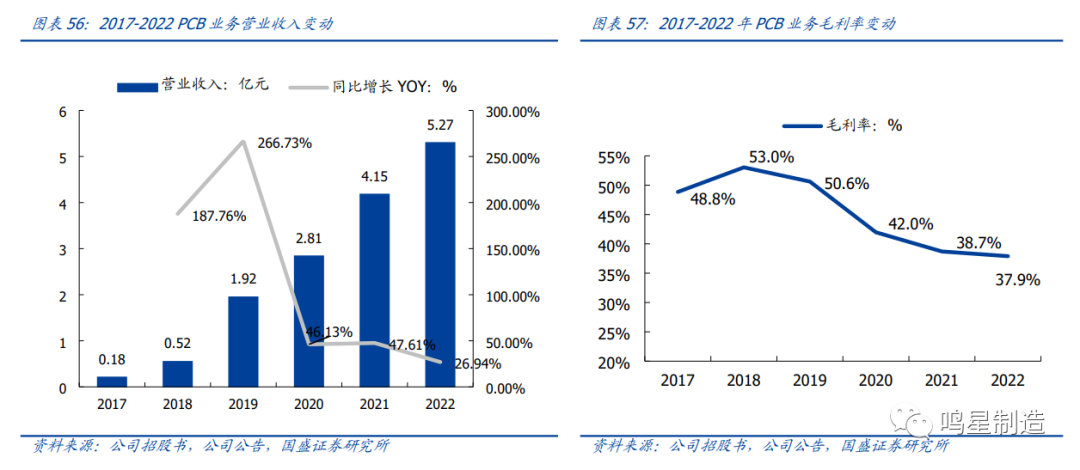 公司PCB业务增速远超行业增速,具备强阿尔法属性。从营业收入来看,2022年公司PCB业务营业收入达5.27亿元,同比增长26.94%,2020-2022年PCB业务营收复合增长率为36.95%;2022年中国PCB曝光设备行业增速为15.29%;同行大族数控2022年营收增速为-31.72%,对比可见,芯碁PCB业务增速远远超过行业增速,具备强阿尔法属性。以毛利率来看,公司PCB业务毛利率从2018年的53.04%下滑至2022年的37.90%,近几年略有下滑,主要原因是新产品在生命周期早期,毛利率略高,随着逐渐量产,下游客户采购量提升,公司给予部分客户批量采购价格;此外,公司于2021年下半年开始推广中阶产品(精度30-40μm),整体毛利率略微下滑。公司不断推进产品更新换代,相应推出NEX防焊系列等新产品,在技术与创新、产品应用场景、客户资源与市场开拓方面具备核心竞争力,不断深化阻焊层设备应用,切入头部客户鹏鼎实行大客户战略,积极开拓海外市场,不断扩展发展空间。