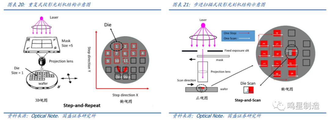 投影式光刻。投影式光刻通过透镜系统缩放掩膜图案至衬底表面,成像质量与掩膜至衬底的距离无关,仅受光学成像系统影响,几乎克服了接触式曝光和接近式曝光中的常见问题。投影式光刻可分为步进重复式投影光刻机(DSW)和步进扫描式投影光刻机(SCANNER)。