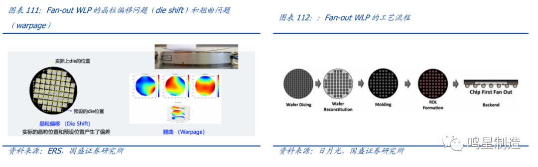 (2)扇出式晶圆级封装(Fan-out WLP,简称FOWLP):是基于晶圆重构技术,先将晶圆上的芯片切割,并将芯片之间拉开一段距离形成扇出区,再转移至人工晶圆(即载体wafer,类似约200mm或300mm的圆形形态,后续也用来做RDL层)后封装切割。其优点在于将外部金属球制作在了芯片面积外的扇出区,因而可以接纳更多的接脚数。