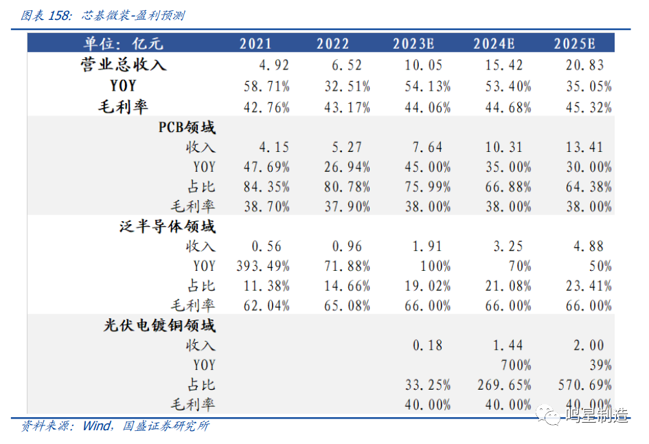 *泛半导体领域:布局范围广、行业空间大,公司业绩翻倍增长。在先进封装与Mini/Micro LED渗透率提升趋势下,叠加国产替代背景下,公司作为国内泛半导体直写光刻设备龙头有望显著受益。1)IC载板空间广阔,公司为国产替代领军者。公司部分产品已接近或超越全球头部企业,技术优势趋显。另外,定增支撑IC载板产能扩张,海外市场不断寻求突破。2022年11月,公司MAS直写光刻设备成功销往日本市场。2)先进封装是后摩尔时代下的明星,空间大、增速高,公司有望深度受益。直写光刻技术自适应调整能力强,公司先进封装产品WLP2000优势明显,产品矩阵不断扩充,其晶圆级封装光刻设备已验收,主要客户有华天科技、辰显光电等。3)Mini/Micro LED前景广阔,带来直写光刻设备市场新增量。在Mini/MicroLED阻焊层曝光中,直写光刻技术为未来主流方向,公司以NEX-W(白油)机型为重点,以点带面切入客户供应链。目前已开拓维信诺、辰显光电、沃格光电等优质客户。我们预计2023-2025年公司泛半导体业务实现收入1.9、3.3、4.9亿元,同比增长100%、70%、50%;毛利率维持在66%。光伏电镀铜领域:以铜代银势在必行,电镀铜是平台型技术,公司将率先且深度受益。光伏用银需求量大且增速高、而银浆供给短缺,因此去银化是必然选择,电镀铜降本增效优势明显,以铜代银势在必行。电镀铜是平台型技术,不止是HJT,TOPCon、BC均可应用,空间巨大。电镀铜制备过程中,图形化是最核心、壁垒最高的环节。公司是光伏图形化设备龙头,率先布局、技术路线布局多元、客户覆盖范围广,有望率先且深度受益。我们预计2023-2025年公司光伏电镀铜业务实现收入0.2、1.4、2.0亿元,毛利率维持在40%。