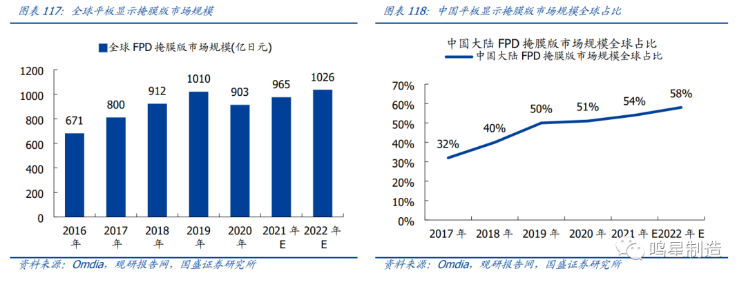 *平板显示掩膜版:依据Omdia数据,全球平板显示掩膜版市场规模从2016年的671亿日元预计上升至2022年的1026亿日元,CAGR为7.3%。2016-2021年,全球平板显示掩膜版市场规模整体呈波动上升趋势,虽2020年受全球新冠疫情冲击有所下滑,但预计2021年回升至965亿日元,预计2022年可达1026亿日元。同时,中国大陆平板显示掩膜版市场规模全球占比也在逐年上升,预计2022年全球占比可达58%。