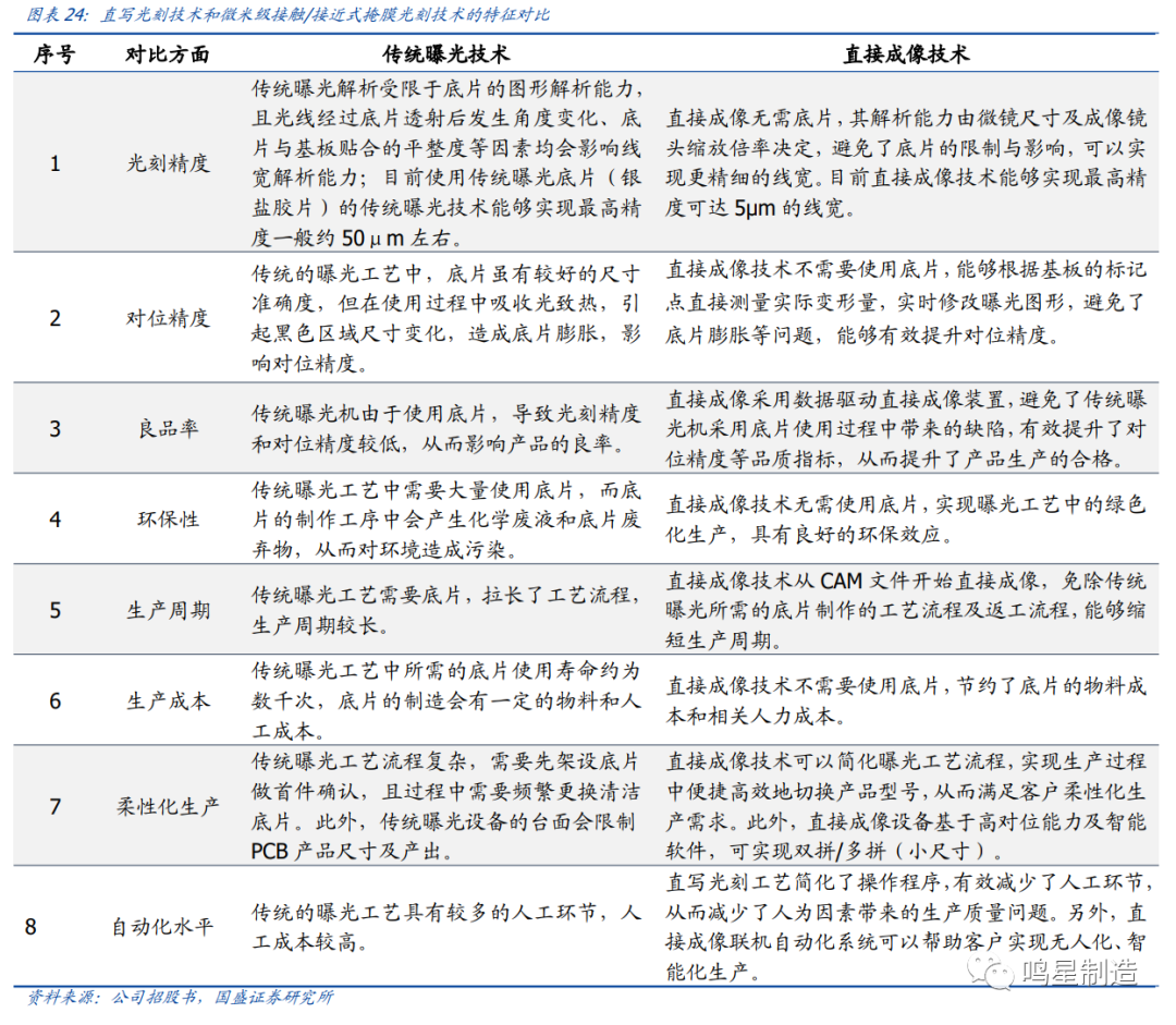 PCB呈中高端化趋势,直写光刻相比传统曝光优势明显。根据PCB制造步骤,内外层电路以及阻焊环节均需要使用PCB曝光设备。随着下游需求持续演变和技术发展,直写光刻设备优势凸显。基于下游需求的发展演变,HDI、柔性板、类载板等中高端PCB产品需求不断提升,日益窄小的线宽/线距对图形成像精度、对位精度、以及成品率要求不断提升,越多层(复杂)、越先进的板对直写光刻技术的需求也会更明确。为了迎合精细线路制作需求,直写光刻技术凭借在光刻、对位精度等指标上的优势表现,以及更短周期、更低成本、更为环保和自动化的特点使PCB产品性能突出、更加可靠,在中高端PCB制造领域内具有较为成熟的市场应用。