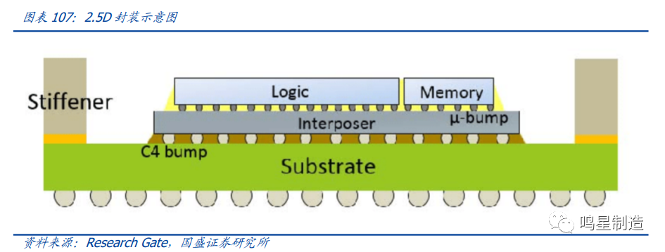 *2.5D 封装。2.5D封装是传统2D封装技术的进步,即在后者基础上,于芯片和封装基板间加入硅中介层(interposer),芯片并排放置在该硅中介层顶部,通过芯片的微凸块(μBump)和硅中介层中的布线互连,硅中介层再利用TSV连接上下表面的金属,最后通过锡球(C4)焊接至传统2D的封装基板上。2.5D 封装在容量及性能上比2D结构得到巨大提升,可实现更精细的线路与空间利用。
