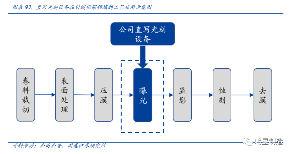光刻技术应用:引线框架领域直写光刻存在传统替代趋势,蚀刻工艺成为未来发展主要方向。引线框架领域,目前有直写光刻技术的蚀刻工艺和传统冲压工艺两种选择。在应用上,根据生产经验,100 脚位以上的引线框架生产主要采用蚀刻工艺,100 脚位以下的引线框架生产主要采取冲压工艺。传统的冲压工艺是指首先制造出模具,再运用模具通过机械力作用对金属材料进行冲切,从而形成复杂电路图案的生产工艺。而蚀刻工艺主要采用光刻及溶解金属的化学试剂从金属条带上蚀刻出图案。虽然传统冲压工艺具有生产成本优势,但由于精度相对较低且无法生产超薄产品,冲压工艺无法适应当前集成电路精细化发展带来的多脚位和轻薄化封装要求,而蚀刻工艺对曝光精度和灵活性的要求更高,成为引线框架未来发展的主要方向。在该领域内,直写光刻技术不断替代传统的间接曝光技术(如掩膜曝光),对直写光刻设备的需求量不断增长。具体来看,公司直写光刻设备在引线框架上主要用于曝光环节。