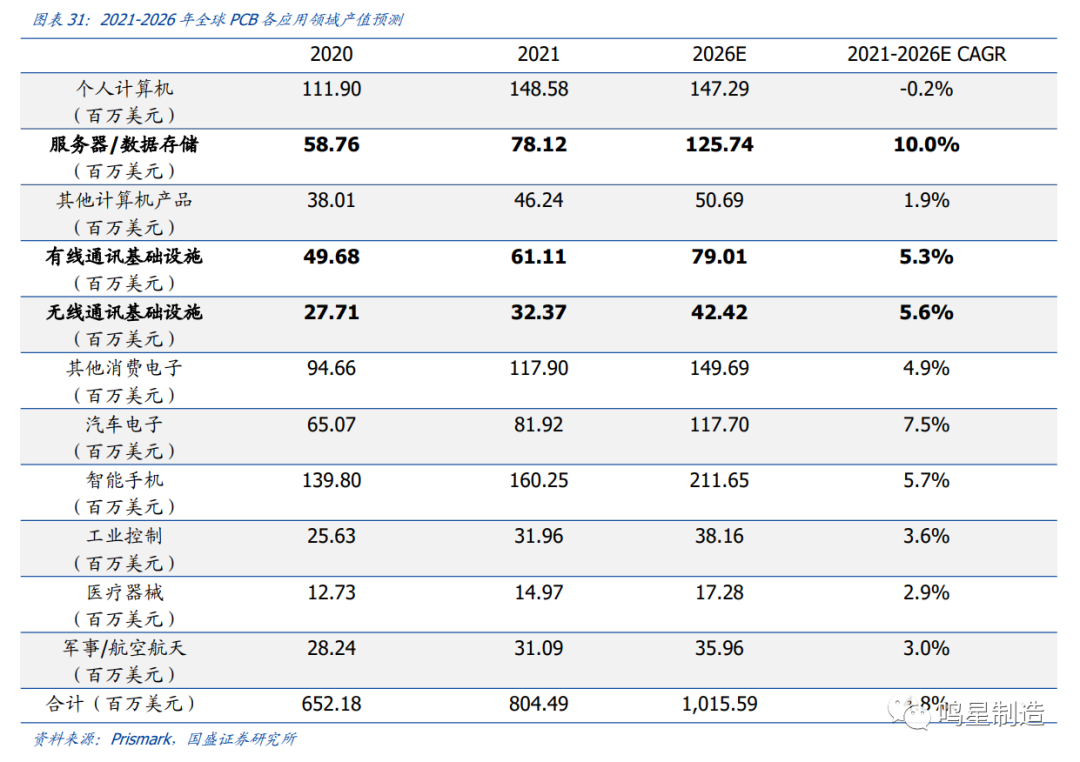 *通信板块需求增长:根据工信部《2022年通信业统计公报》,2022年全国移动通信基站总数达到了1083万个,其中5G基站占比达到了21.3%,较上年末提高了7个百分点,5G基站相比4G基站,PCB的用量有显著的提升,同时对高频高速PCB的需求增加,对通信用PCB来说,有望带来产量和价格的双增长。据Prismark数据统计,应用于有线通讯基础设施和无线通讯基础设施领域的PCB产值在2021-2026年的复合增长率分别为5.3%和5.6%。