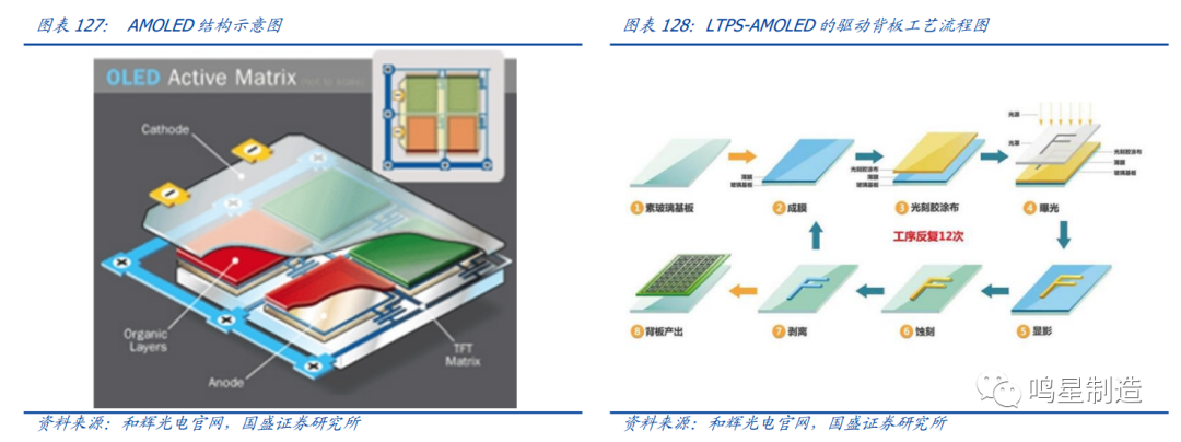 *主动矩阵有机发光二极管(AMOLED)。OLED驱动模式分为被动(PMOLED)与主动(AMOLED)两种,其中AMOLED逐渐成为OLED显示的主流技术。AMOLED(Active Matrix/Organic Light Emitting Diode),即有源矩阵有机发光二极体显示面板,是通过驱动电路来驱动发光二极管,采用独立的薄膜电晶体去控制每个像素,每个像素可以连续且独立的驱动发光。LTPS-AMOLED的制作工艺主要分为背板段,前板段以及模组段三道工艺。AMOLED具有卓越画质、轻薄外形、宽温操作、户外可视、节能省电、健康护眼等优点,但其制作工艺更为复杂,生产成本也较高。