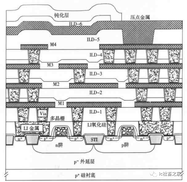 前道工序包含晶体管的制作(有源区的扩散,深阱注入,栅的制造以及浅槽隔离等),后道工序包含金属线和通孔的金属化(铝的金属化,铜的大马士革工艺以及化学机械研磨等)。