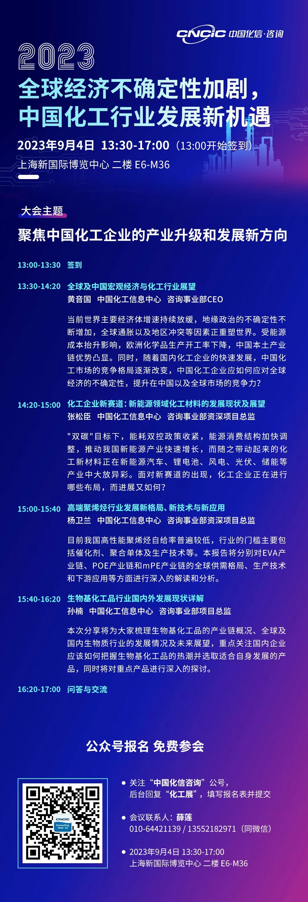 9月4日下午,中国化工信息中心将于2023(第二十届)中国国际化工展览会同期举办客户分享会。此次会议将围绕“全球经济不确定性加剧,中国化工行业发展新机遇”这一课题展开,针对近年热点,如新能源、新材料、高端聚烯烃、生物基化工品等,进行深度分享,同时还将为您带来关于国内化工企业未来发展的思考。
