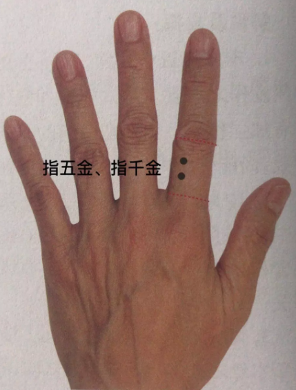 取穴:当食指背第一节中央线外开二分直线上,距第二节横纹三分三为指五金穴,六分六为指千金穴。
