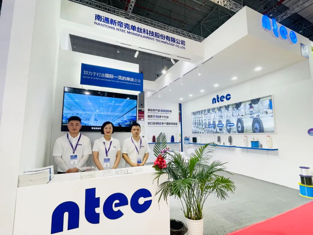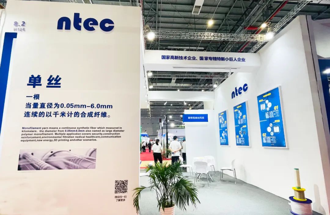南通新帝克单丝科技股份有限公司是国家高新技术企业、国家重点“专精特新”小巨人企业,专注于大直径聚合物单丝的研发、制造与销售,单丝年产能居于世界前列。走进位于8.2号馆H126的新帝克展位,统一着装的营销人员热情洋溢,映入眼帘的NTEC标志代表了NEW TECHNOLOGY新的技术,整体蓝色与白色巧妙融合,纷繁展品整齐陈列,简约与科技感相得益彰。为了呈现一场精彩绝伦的展出,此次新帝克展位以“科技单丝,绿色制造”为主题,多方面介绍了企业规模、科研实力、产品特色,并重点展示了GRS认证循环再生,PLA、PHA、PBS可降解等绿色,生物基PET、PA56等成纤聚合物等系列单丝产品,有力凸显企业由内而外的可持续发展基因。