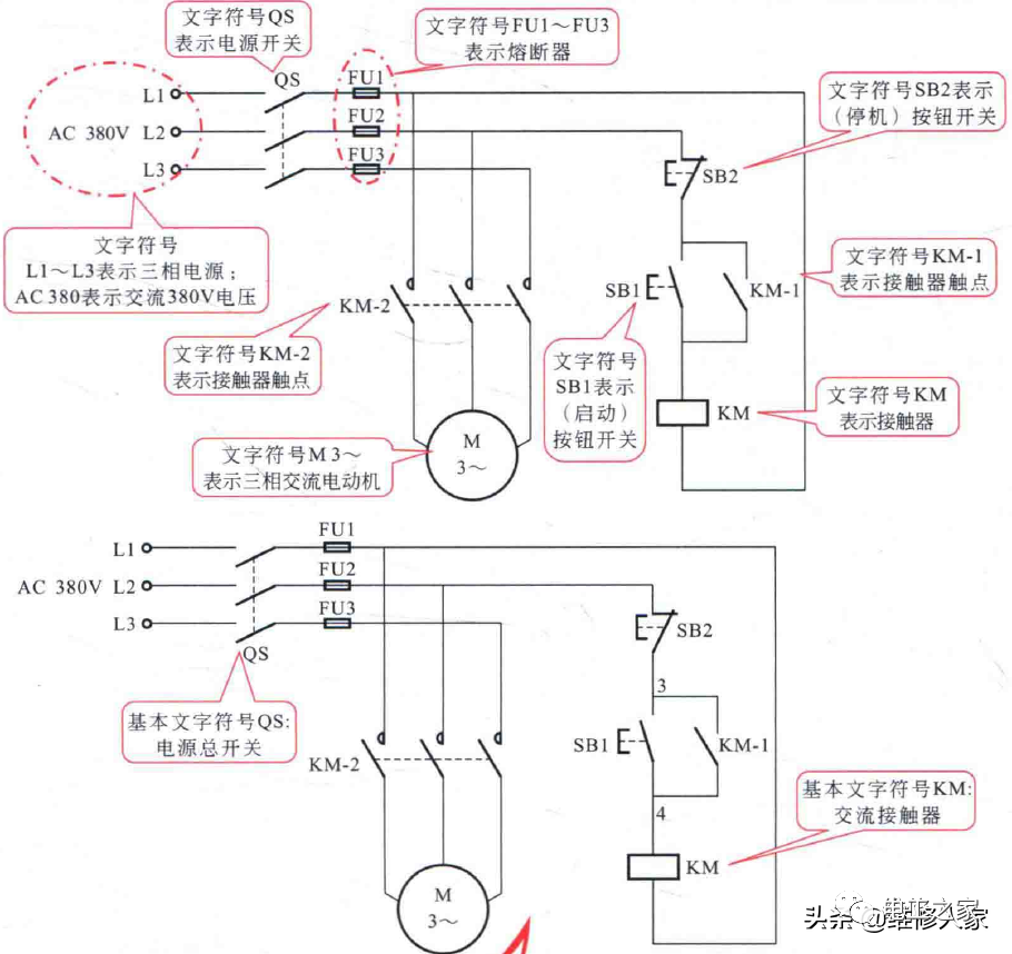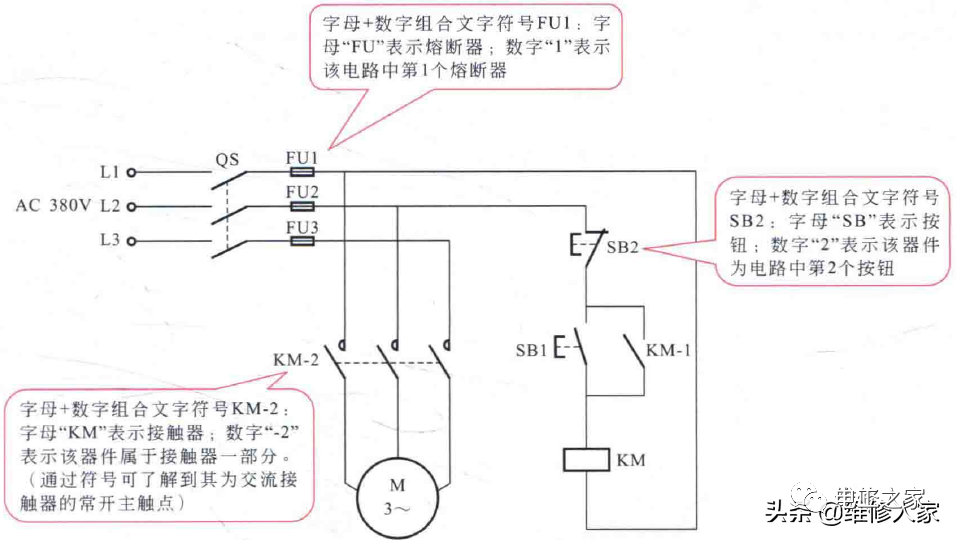 例如图中以字母FU作为文字标识的器件有三个“FU1、FU2、FU3”,分别表示该线路中的第1个熔断器、第2个熔断器、第3个熔断器,且该线路中有三个熔断器;又如,图中KM-1、KM-2中的基本文字符号均为KM,说明这两个器件与KM属于同一个器件,它们是KM中所包含的两个部分,即接触器KM中的两个触点。