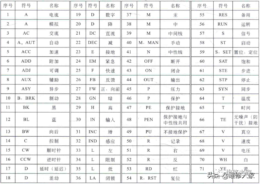 由于大多数电工电路图等技术资料为黑白颜色,很多导线的颜色无法进行区 分,因此在电工电路图上通常用字母代号表示导线的颜色,用于区分导线的功能。