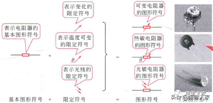 限定符号是一种加在其他图形符号上的符号,用来提供附加的信息,一般不能单独使用,必须与其他符号组合使用,构成完整的图形符号。这样,同一个基本图形符号与不同限定符号组合可构成标识不同含义的器件。如图所示,在电阻器的基本图形符号上,分别加上不同的限定符号,则可以得到可变电阻器、热敏电阻器、光敏电阻器等多种图形符号。电工电路中常见的几 种限定符号如表所列;