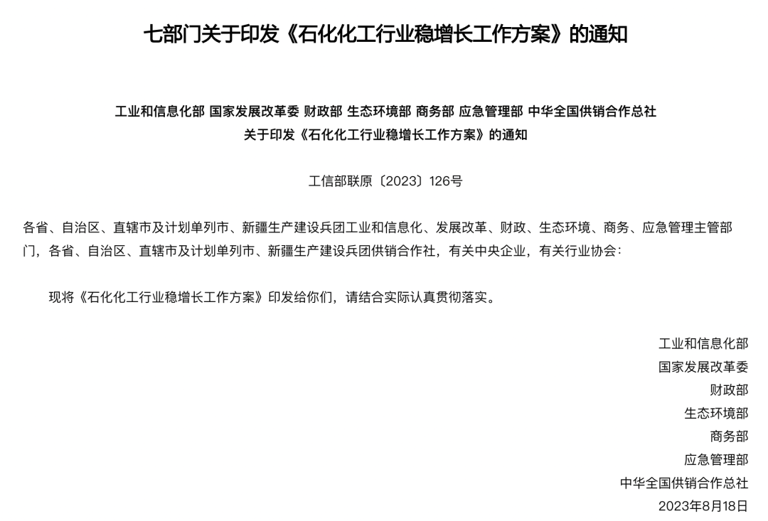 近日,工业和信息化部、国家发展改革委、财政部、生态环境部、商务部、应急管理部、中华全国供销合作总社等七部门发布《石化化工行业稳增长工作方案》。