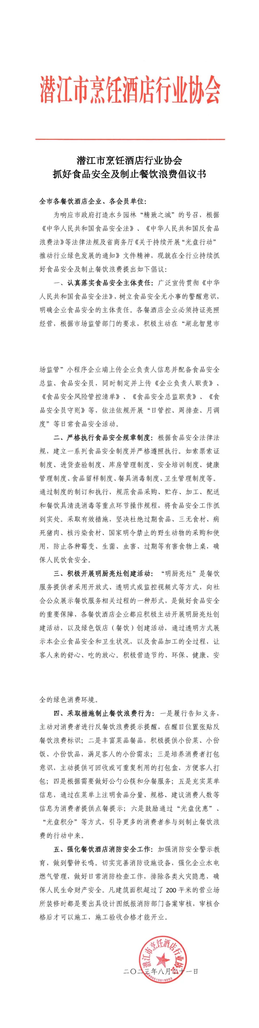 为响应市政府打造水乡园林“精致之城”的号召,根据《中华人民共和国食品安全法》、《中华人民共和国反食品浪费法》等法律法规及省商务厅《关于持续开展“光盘行动”推动行业绿色发展的通知》文件精神,现就在全行业持续抓好食品安全及制止餐饮浪费提出如下倡议:一、认真落实食品安全主体责任:广泛宣传贯彻《中华人民共和国食品安全法》,树立食品安全无小事的警醒意识,明确企业食品安全的主体责任。各餐酒店企业必须持证亮照经营,根据市场监管部门的要求,积极主动在“湖北智慧市场监管”小程序企业端上传企业负责人信息并配备食品安全总监、食品安全员,同时制定并上传《企业负责人职责》、《食品安全风险管控清单》、《食品安全总监职责》、《食品安全员守则》等,依法依规开展“日管控、周排查、月调度”等日常食品安全活动。二、严格执行食品安全规章制度:根据食品安全法律法规,建立一系列食品安全制度并严格遵照执行。如索票索证制度、进货查验制度、库房管理制度、安全培训制度、健康管理制度、食品留样制度、餐具消毒制度、卫生管理制度等。通过制度的制订和执行,规范食品采购、贮存、加工、配送和餐饮具清洗消毒等重点环节操作规程,将食品安全工作抓到实处。采取有效措施,坚决杜绝过期食品、三无食材、病死猪肉、核污染食材、国家明令禁止的野生动物的采购和使用,防止各种霉变、生菌、虫害、过期等有害食物上桌,确保人民饮食安全。三、积极开展明厨亮灶创建活动:“明厨亮灶”是餐饮服务提供者采用开放式、透明式或监控视频式等方式,向社会公众展示餐饮服务相关过程的一种形式,是做好食品安全的重要保障,各餐饮酒店企业都应积极主动开展明厨亮灶创建活动,以及绿色饭店(餐饮)创建活动,通过透明方式展示本企业食品安全和卫生状况,以及食品加工的全过程,让客人来的舒心、吃的放心。积极营造节约、环保、健康、安全的绿色消费环境。四、采取措施制止餐饮浪费行为:一是履行告知义务,主动对消费者进行反餐饮浪费提示提醒,在醒目位置张贴反餐饮浪费标识;二是丰富菜品餐品,积极提供小份菜、小份饭、小份饮品,满足客人的小份需求;三是培养消费者打包意识,主动提供可回收或可重复利用的打包盒,方便客人打包;四是根据需要做好公勺公筷和分餐服务;五是充实菜单信息,通过在菜单上注明食品分量、规格、建议消费人数等信息为消费者提供点餐提示;六是鼓励通过“光盘优惠”、“光盘积分”等方式,引导更多的消费者参与到制止餐饮浪费的行动中来。五、强化餐饮酒店消防安全工作:加强消防安全警示教育,做到警钟长鸣。切实完善消防设施设备,强化企业水电燃气管理,做好日常消防检查工作,排除各类火灾隐患,确保人民生命财产安全。凡建筑面积超过了200平米的营业场所装修时都是要出具设计图纸报消防部门备案审核,审核合格后才可以施工,施工验收合格才能开业。