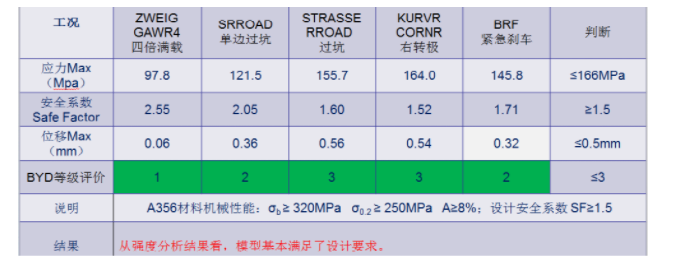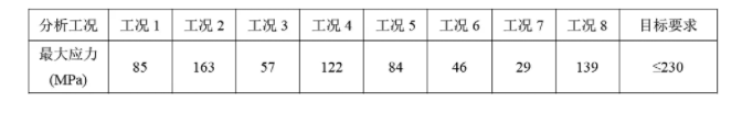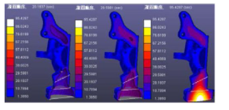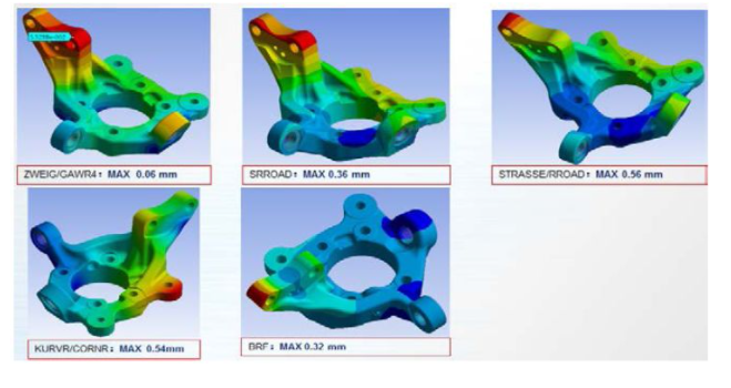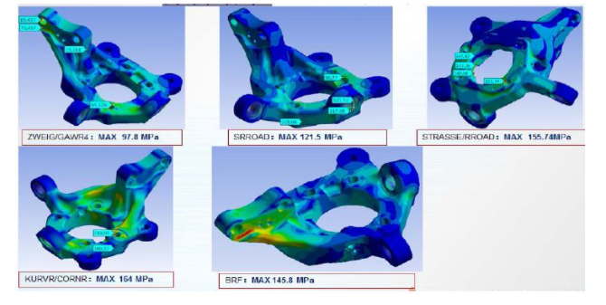 经对铝合金转向节不同工况受力CAE分析,如图12和13所示。得到强度分析结果如表4