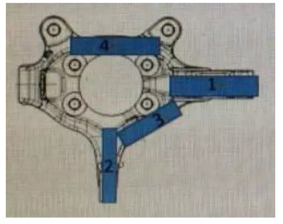 挤压铸造转向经T6热处理,固溶温度为530℃保温480min,40℃水冷,失效温度为180℃保温360min。从铸件本体取样测试力学性能,取样位置见图10所示。材料拉伸性能检测结果如表3所示,达到设计要求。