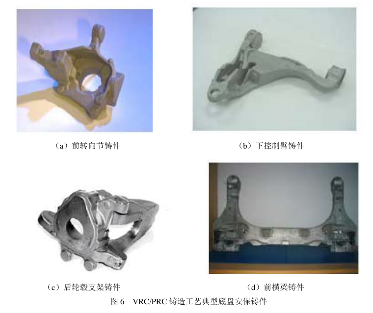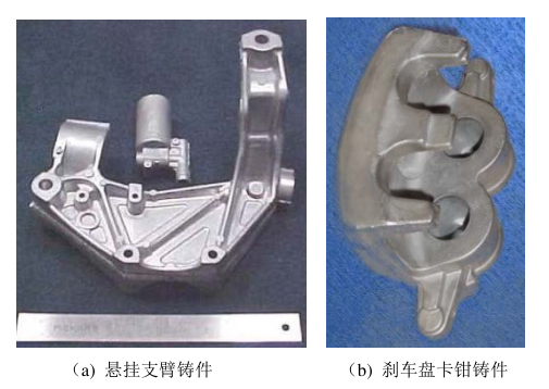 Aloca 公司已利用该工艺技术,建立了具备批量生产能力的自动铸造单元,生产了近 4000 万个汽车底盘安保铝合金铸件,如控制臂、转向节、轮廓支架等,如图 6 所示,已被应用于福特、通用等多种车型,获得了很好的减重和使用效果。