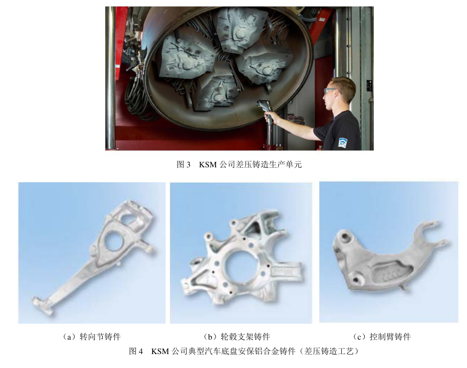 德国凯世曼铸造集团(The KSM Castings Group)是世界范围内利用差压铸造工艺生产汽车底盘铝合金铸件的领先单位,开发出多种底盘安保铝合金铸件, 并已建成了具有批量生产能力的差压铸造生产单元,如图 3 所示。所开发的汽车底盘安保铝合金铸件(如图 4 所示) 已被应用于大众、 宝马、 奔驰等多种车型,获得了很好的减重和使用效果。