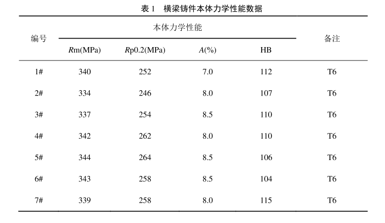 国内沈阳铸造研究所利用该工艺技术为某电动汽车制造企业开发出底盘横梁铸件(如图1所示),经检验,铸件本体力学性能可满足设计单位提出的技术指标要求(表1为横梁铸件本体解剖性能),并经用户单位台架检测,铸件可以满足装车要求。