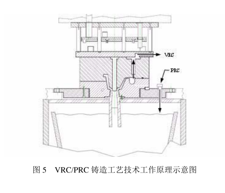 该工艺技术主要工作原理是:采用一个变频真空系统与模具相连接,将模具型腔中的气体全部抽出,保证金属液在充型的过程中平稳流动并且不产生氧化夹杂。当铸型充满之后,在金属熔体的表面施加压力用来凝固补缩,从而保证获得组织致密的铝合金铸件。另外,在金属模具中设置多个水冷回路, 使铸件形成快速、 渐进、 “自顶向下”的定向凝固顺序,获得批量接近零缩孔的铸件, 并缩短循环周期, 图 5 为 VRC/PRC 铸造工艺技术工作原理示意图。