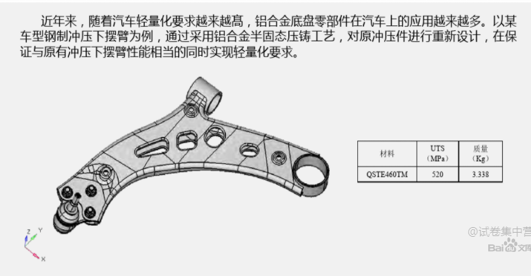 低压铸造工艺是由英国人 EF.LAKE 于 1910 年提出并申请专利的一种铸造成形工艺, 该工艺的主要工作原理是:坩埚中的金属液在压力的作用下沿升液管自下而上克服重力及其它阻力充填铸型,并在压力下获得铸件 。该工艺是目前汽车制造领域应用广泛的铝合金铸造成型工艺技术,被广泛应用于汽车轮毂、发动机缸体、缸盖等铸件,获得了很好的应用效果。金属型低压铸造工艺是其中较为重要的一种,它可利用金属型较强的激冷作用,提高铸件的凝固速度,从而获得性能较高的铸件,是汽车底盘安保铝合金铸件较为适宜的铸造工艺技术。
