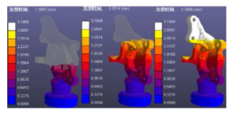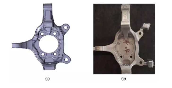 转向节采用宇部HVSC-800PL卧式挤压铸造机生产,在模具设计上采用间接挤压工艺布置。对铝合金转向节挤压铸造工艺进行前期模拟分析,结果表明,凝固过程中最后的液相区在零件前轮中心中部偏下,铸件热节也在此处集中,存在缩孔或缩松的危险,为保证充型平稳及凝固能够很好的补缩,中间与轮毂连接的圆孔部位进行填实处理,结合水冷加局部挤压进行改善。由于前期工作做的仔细认真,后期实验中除在模具上加开排气槽和修改挤压销间隙外,整个过程基本没出现大的麻烦。
