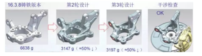 零件的技术要求:抗拉强度σb≧310MPa,A≧8%,σ0.2≧250MPa。首先对零件进行结构设计,材料选用铸造铝合金 A356;设计重量3197g (约3.2Kg较铸铁版本减重超过50%),结构如图3所示。设计指标:挤压铸造铝合金转向节抗拉强度大于340MPa,屈服强度大于250MPa,伸长率≥10% 模具寿命≥8万,废品率<2.3%,挤压铸造周期120S。