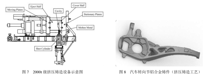 图 7 为美国 Formcast 公司开发的 2000t 级卧式挤压铸造设备,其主要工作原理是:利用挤压活塞将压室内的金属液推动到模具型腔之内,并持续保持压力,直至金属液凝固完毕。利用该工艺设备,Formcast公司已开发出多种类型的汽车底盘安保铝合金铸件(如图 8 所示),并已为多家大型汽车制造商供货。