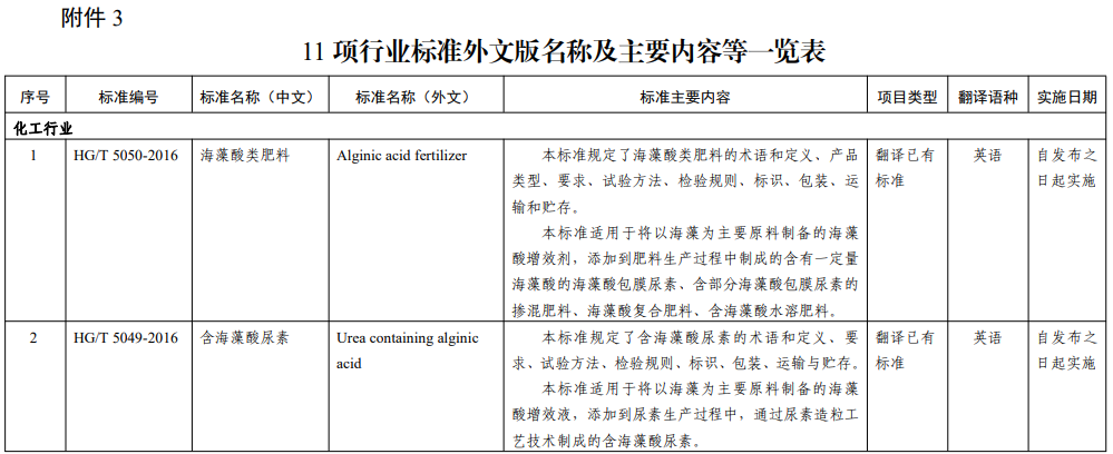 《海藻酸类肥料》等11项行业标准外文版包括化工行业9项、轻工行业1项、纺织行业1项。