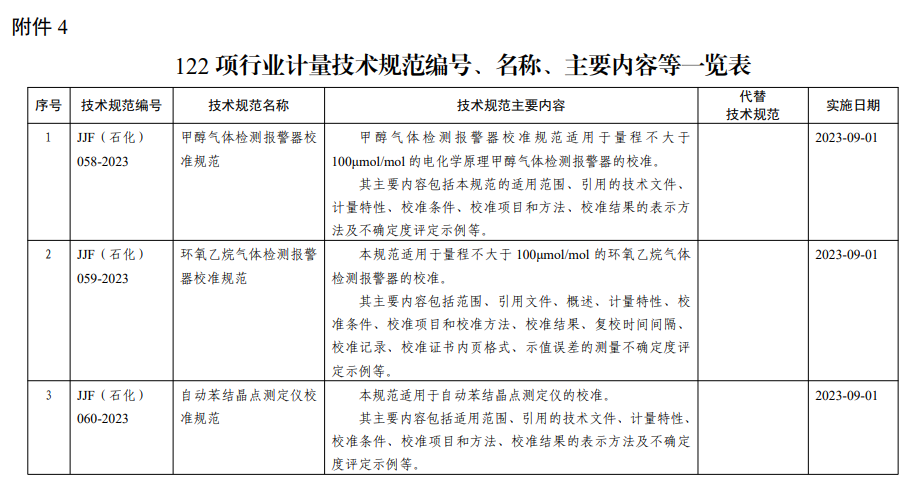 【《甲醇气体检测报警器校准规范》等122项行业计量技术规范(部分)】