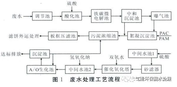 通过图1得知,项目废水首先进到调节池完成水质水量调整,再通过潜水泵上升至酸化池。经过投入硫酸把废水调节到强酸性后,废水流向铁碳微电解池,由此清除废水内的一些有机物、COD、色度,并提升废水生化性。铁碳微电解池出水进到中和池,加入石灰液,调整废水到强碱性,然后进到曝气池,经过曝气吹出废水里一些氨后进到絮凝沉淀池,清除废水内的固体悬浮成分。之后经中间池1(调酸)后进入催化氧化塔,降解水中大分子和难降解物质后,最后经过A/O生化池处理,能达标排放。