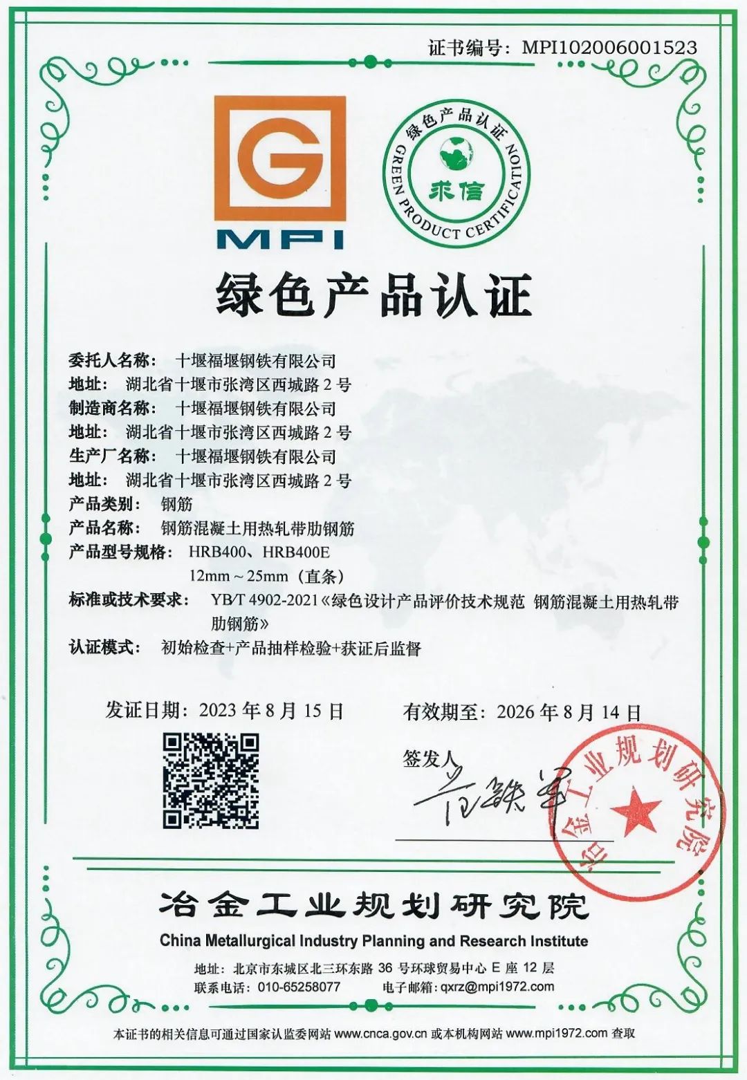 十堰福堰钢铁有限公司践行绿色发展理念,积极申请钢筋混凝土用热轧带肋钢筋绿色产品认证。经过文件评审、现场检查、质量抽查等工作,其产品满足《绿色设计产品评价技术规范 钢筋混凝土用热轧带肋钢筋》(YB/T 4902-2021)行业标准要求,顺利通过冶金规划院绿色产品认证。