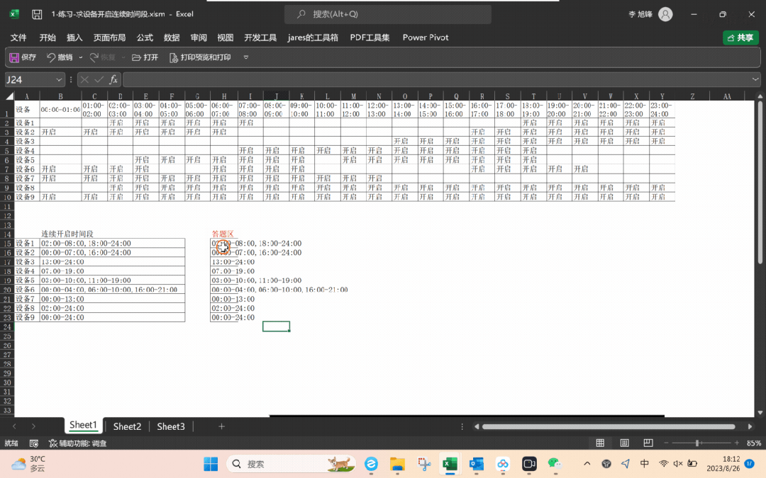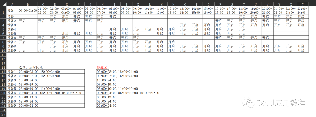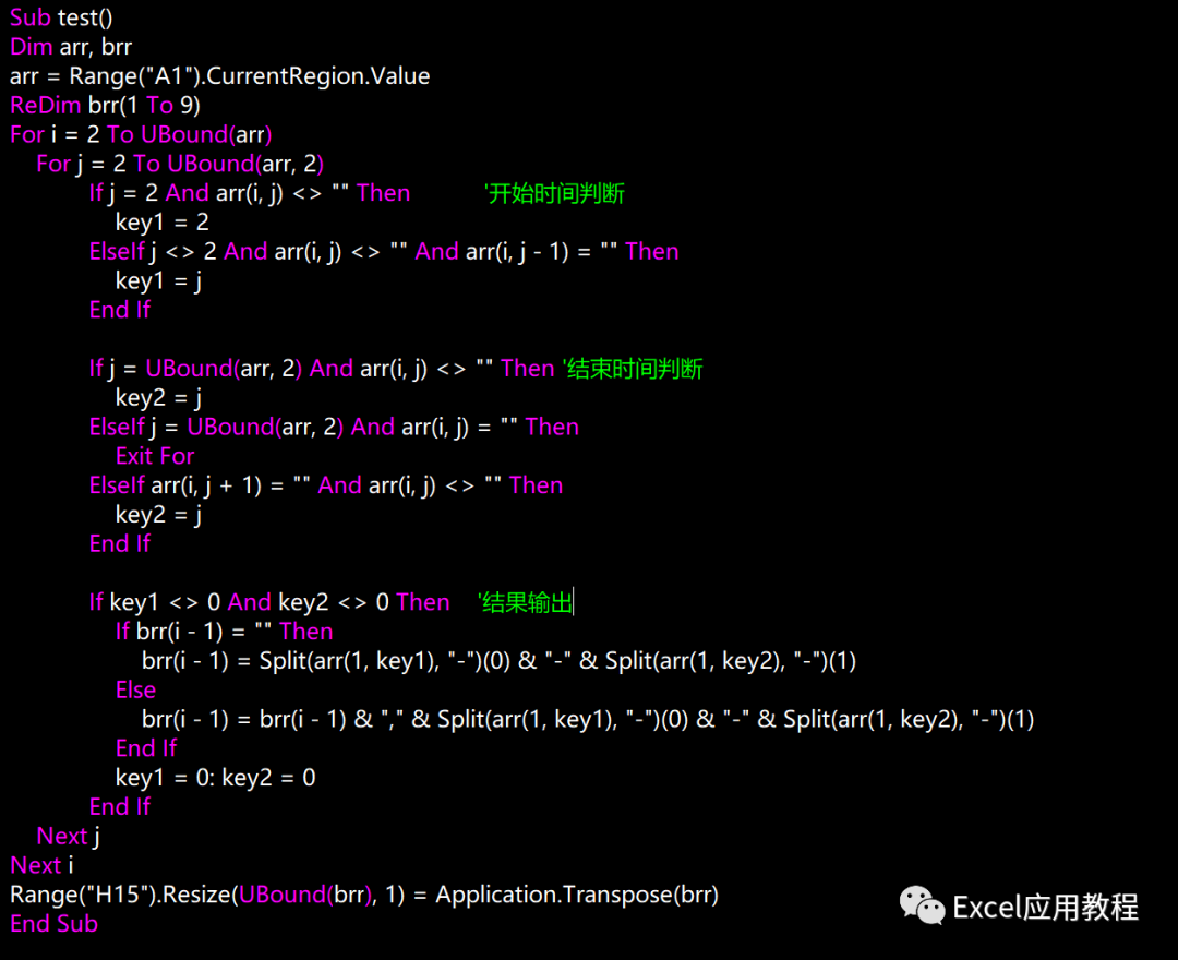 Sub test()Dim arr, brrarr = Range("A1").CurrentRegion.ValueReDim brr(1 To 9)For i = 2 To UBound(arr)For j = 2 To UBound(arr, 2)If j = 2 And arr(i, j) <> "" Then '开始时间判断key1 = 2ElseIf j <> 2 And arr(i, j) <> "" And arr(i, j - 1) = "" Thenkey1 = jEnd IfIf j = UBound(arr, 2) And arr(i, j) <> "" Then '结束时间判断key2 = jElseIf j = UBound(arr, 2) And arr(i, j) = "" ThenExit ForElseIf arr(i, j + 1) = "" And arr(i, j) <> "" Thenkey2 = jEnd IfIf key1 <> 0 And key2 <> 0 Then '结果输出If brr(i - 1) = "" Then- 1) = Split(arr(1, key1), "-")(0) & "-" & Split(arr(1, key2), "-")(1)Else- 1) = brr(i - 1) & "," & Split(arr(1, key1), "-")(0) & "-" & Split(arr(1, key2), "-")(1)End Ifkey1 = 0: key2 = 0End IfNext jNext i1) = Application.Transpose(brr)End Sub