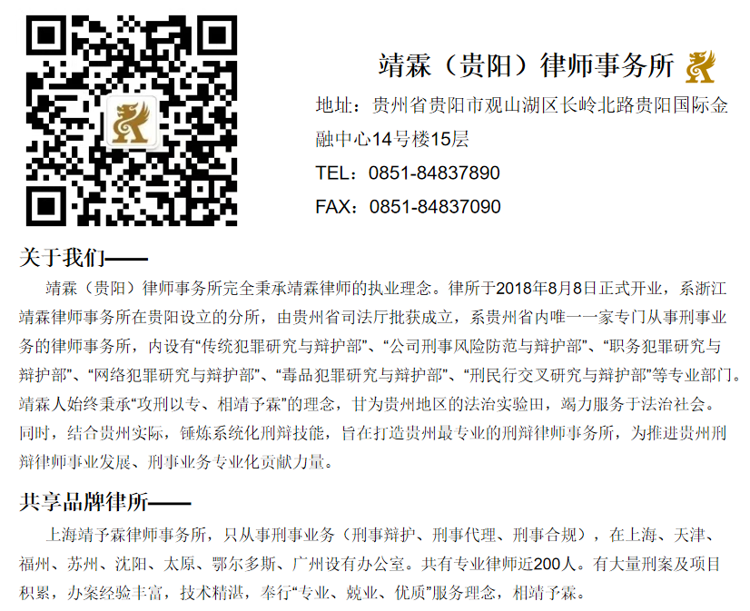 浙江靖霖律师事务所,只从事刑事业务(刑事辩护、刑事代理、刑事合规)。靖霖刑事律师在北京、上海、杭州、济南、昆明、武汉、贵阳、义乌设有办公室,共有专业律师200余人。出版专业书籍十本,有大量刑案及项目积累,办案经验丰富,技术精湛,奉行“专业、兢业、优质”服务理念,相靖予霖。