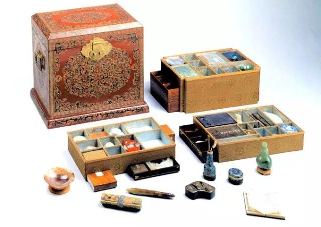 移开这个托盘,则可见八九个大小不一的盒子,盒子内除了历朝历代的瓷碗、玉瓶、书画等,还有来自日本的莳绘盒。