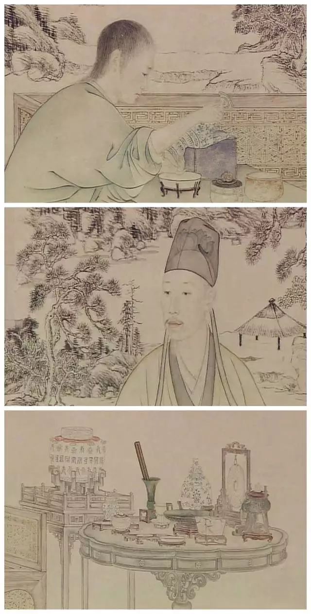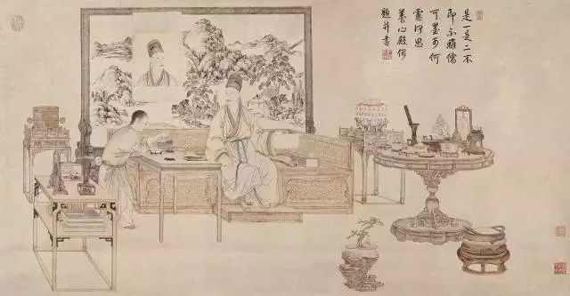 (《乾隆帝是一是二图轴》郎世宁 作,表现了乾隆皇帝鉴赏古物的情景)