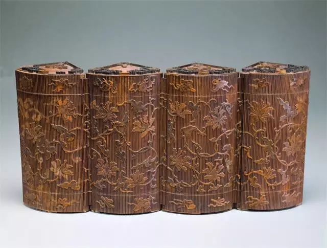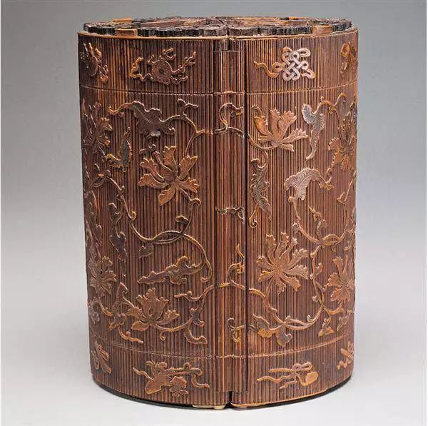 这件“竹丝缠枝番莲多宝阁圆盒”利用机轴原理,将圆筒形盒分成四个扇形。