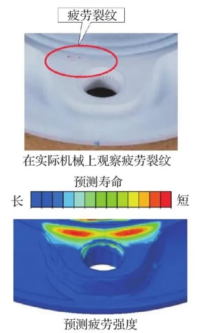 在得到各载荷条件下的应力分布后,采用疲劳分析软件fe-safe进行后处理,确定了疲劳耐久性。轮毂凸缘有车制面和锻制面,由于表面粗糙度的不同,采用了不同的强度准则。通过数值分析预测的最薄弱部分以及耐久性试验后渗透检验中发现的疲劳裂纹的着色和观察照片如图14所示。一系列数值分析使与实际机械几乎相同位置的损伤预测成为可能。众所周知,疲劳损伤不仅受重复循环应力的影响,还受轮毂轴承单元制造过程中锻造和热处理产生的残余应力的影响。考虑这些在分析模型方面的影响,希望进一步提高强度预测的精度。